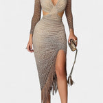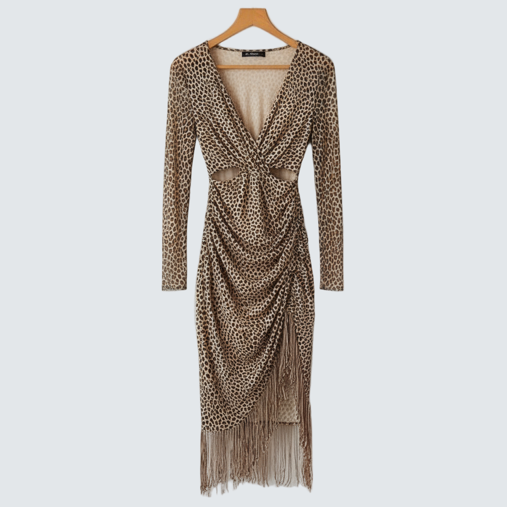 Ирена е смел моден избор, който съчетава дивата секси привлекателност и модерна изисканост. Този удивителен дизайн с плътно прилягане в кафяв градиентен леопардов модел точно подчертава извивките и създава незабравим стил. Неговите уникални детайли го правят перфектен избор, когато искате да се откроите от тълпата.