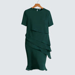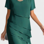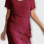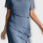 Роклята Мариса съчетава класическа красота с нежно модерен дизайн. Леко наслоен шифон се слива с тялото и създава грациозно движение при всяка стъпка, докато кръглото деколте и късите ръкави придават дискретен и универсален вид. Този модел е създаден за комфорт и увереност – идеален за обществени събития, семейни тържества или елегантни вечери.