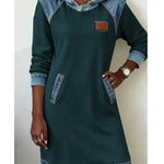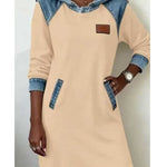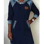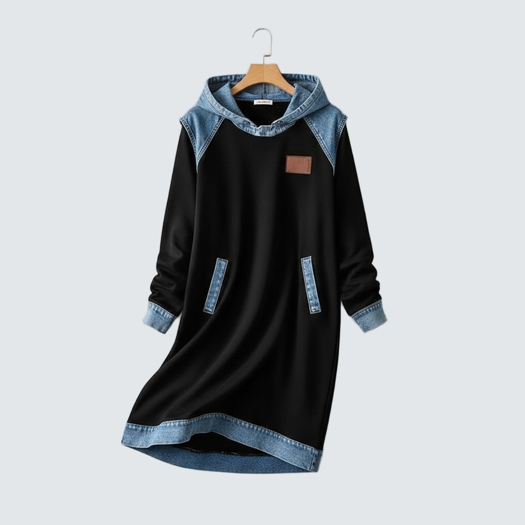 Тази рокля с капюшон перфектно комбинира градския комфорт с уникален чар. Свободният крой и мекият материал са идеални за ежедневна носене, докато контрастните дънкови вложки на капюшона, раменете и подгъва придават индивидуалност и модерен, уличен привкус. Това е модерен и практичен елемент, който ще ви облече за всякакъв повод - от уикендно отпускане до разходка из града. Получете уникален и стилен вид без усилие.