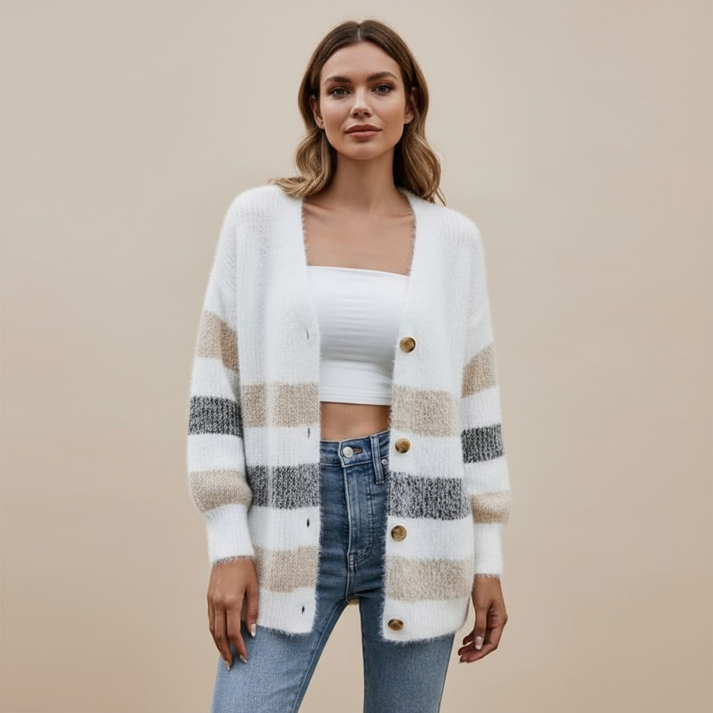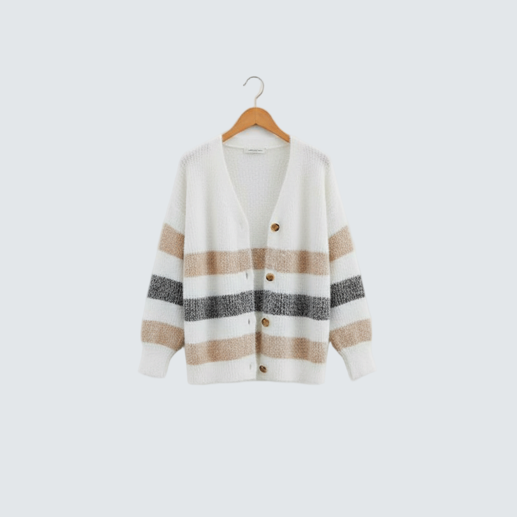 Открийте кардигана Ванда, който съчетава уют, стил и универсална елегантност. Благодарение на своя небрежен крой, нежни райета и практично закопчаване с копчета, той ще стане незаменима част от гардероба ви. Идеален за ежедневна носене и за моменти, когато искате да изглеждате небрежно елегантно.