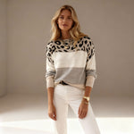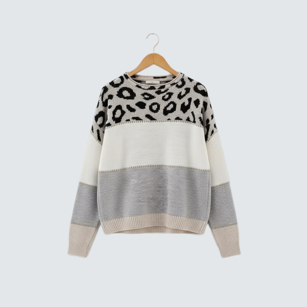 Влезте в сезона с изключително елегантния пуловер Вероника, който съчетава модерен дизайн с внимание към детайла. Животинската шарка в комбинация с нежни блокове придава на този артикул уникален характер – идеален за жени, които искат да изглеждат стилно, но същевременно да се наслаждават на максимален комфорт.
