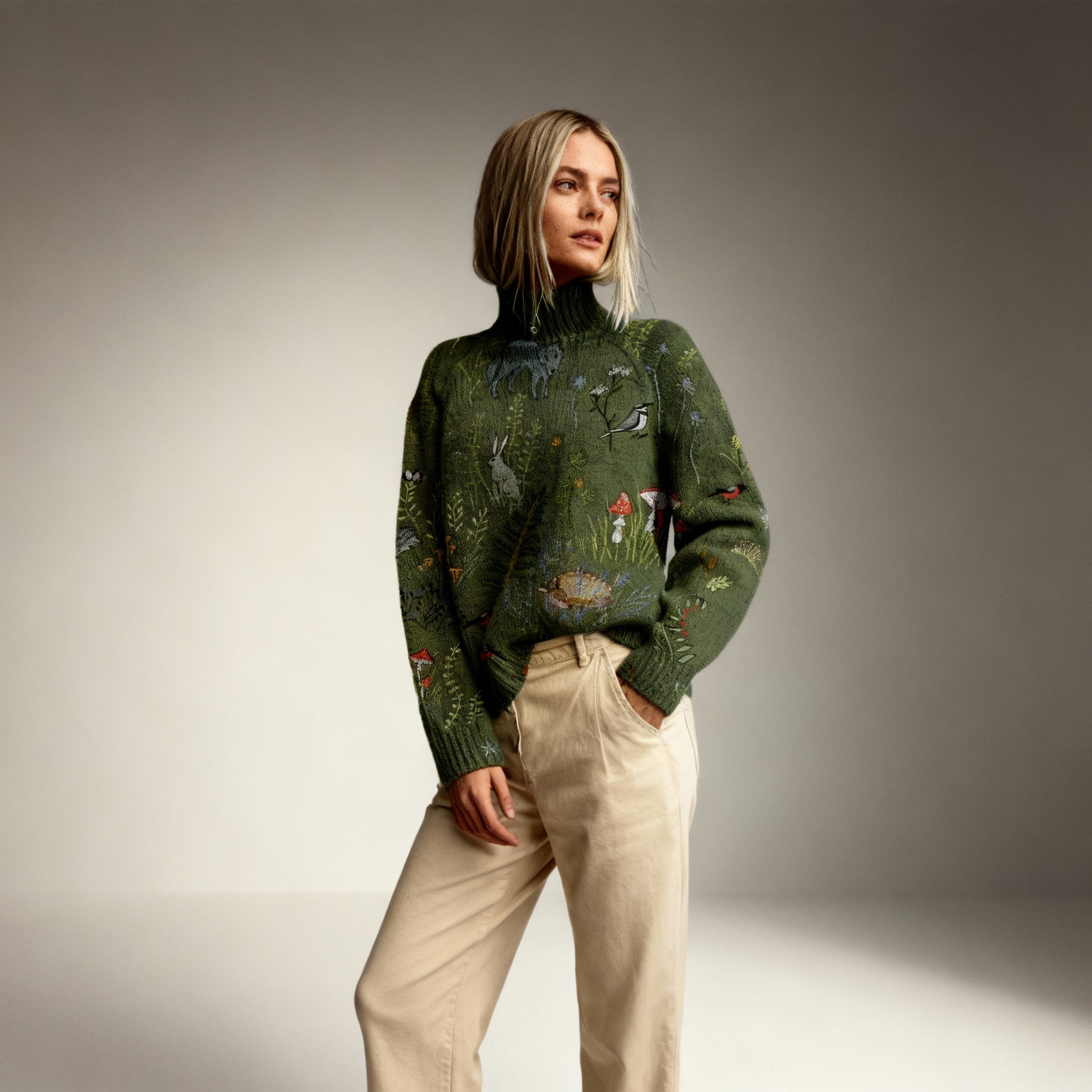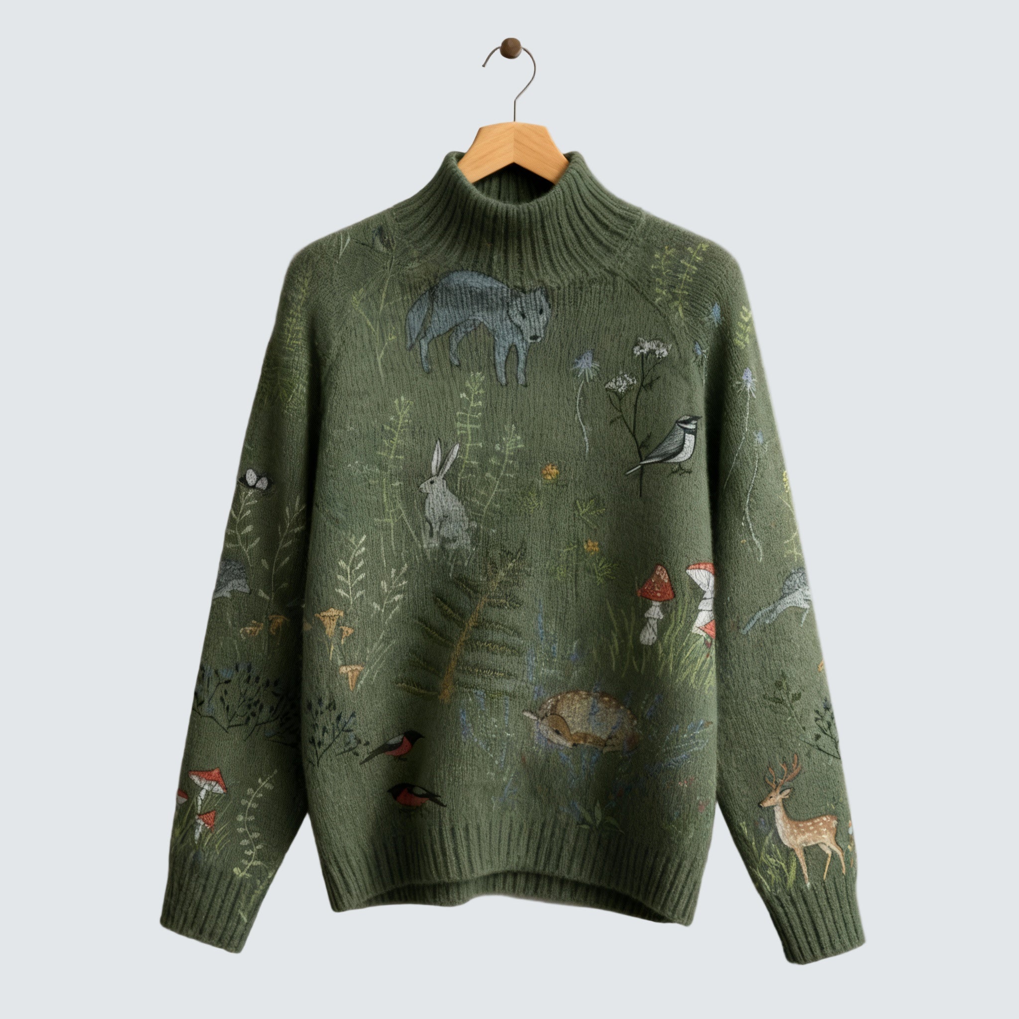 Нашият пуловер Софи определя ежедневния комфорт, но с нотка на загадъчна елегантност. Изработен от ултра мек и дишащ трикотаж с топъл ролак, този модел ще ви обгърне в приятна топлина. Уникалният горски мотив с животни (вълци, зайци, гъби) му придава оригинален и вечен вид, който подхожда на работни панталони и уикенд дънки. Той е перфектният спътник за хладни дни, независимо дали релаксирате у дома или излизате на разходка в природата.