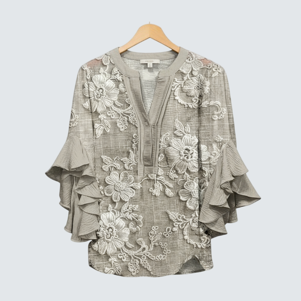 Украсете своята елегантност с този бежов топ, който е украсен с нежни бели цветни мотиви. Ръкавите с волани добавят женственост и движение, а свободният му силует осигурява комфорт във всеки ваш аутфит, независимо дали за ежедневни или тържествени моменти.