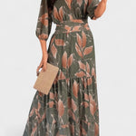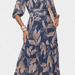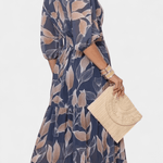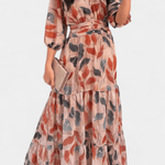 Роклята Aïsha съчетава изискан листен модел с лек и елегантен силует, който естествено подчертава фигурата. Дълбокото V-образно деколте, свободните ръкави и акцентирания талия правят тази рокля перфектен избор за моменти, когато искате да се чувствате специални – без усилие. Идеална както за формални поводи, така и за слънчеви дни с стил.