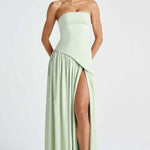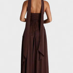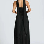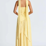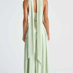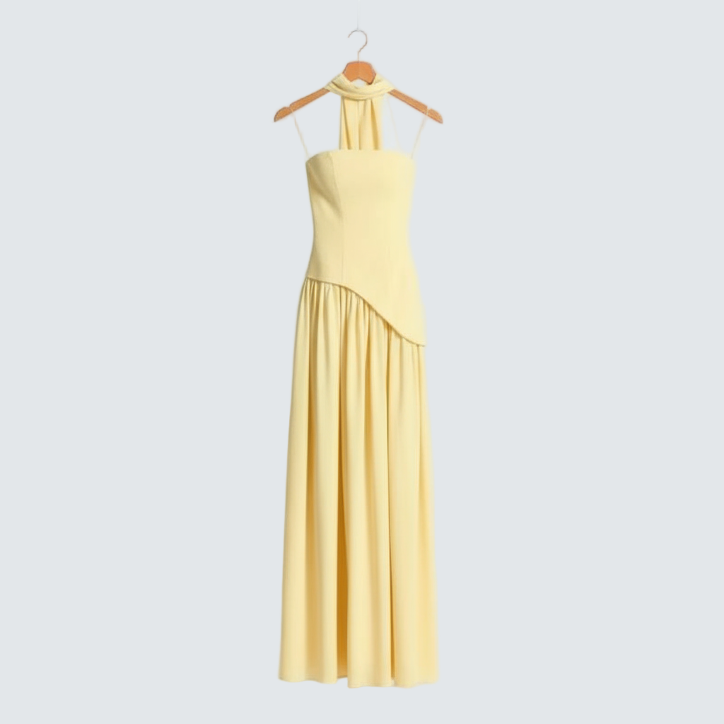Роклята Amary представлява съчетание на модерна елегантност и смел дизайн. Прилепналият връх подчертава силуета, докато асиметричната талия и дългата свободна пола придават на движението лекота и грация. Отделяемият шал позволява да променяте стила според настроението — може да се носи като аксесоар около врата, завързан на гърба или свободно спуснат за изискан вид.