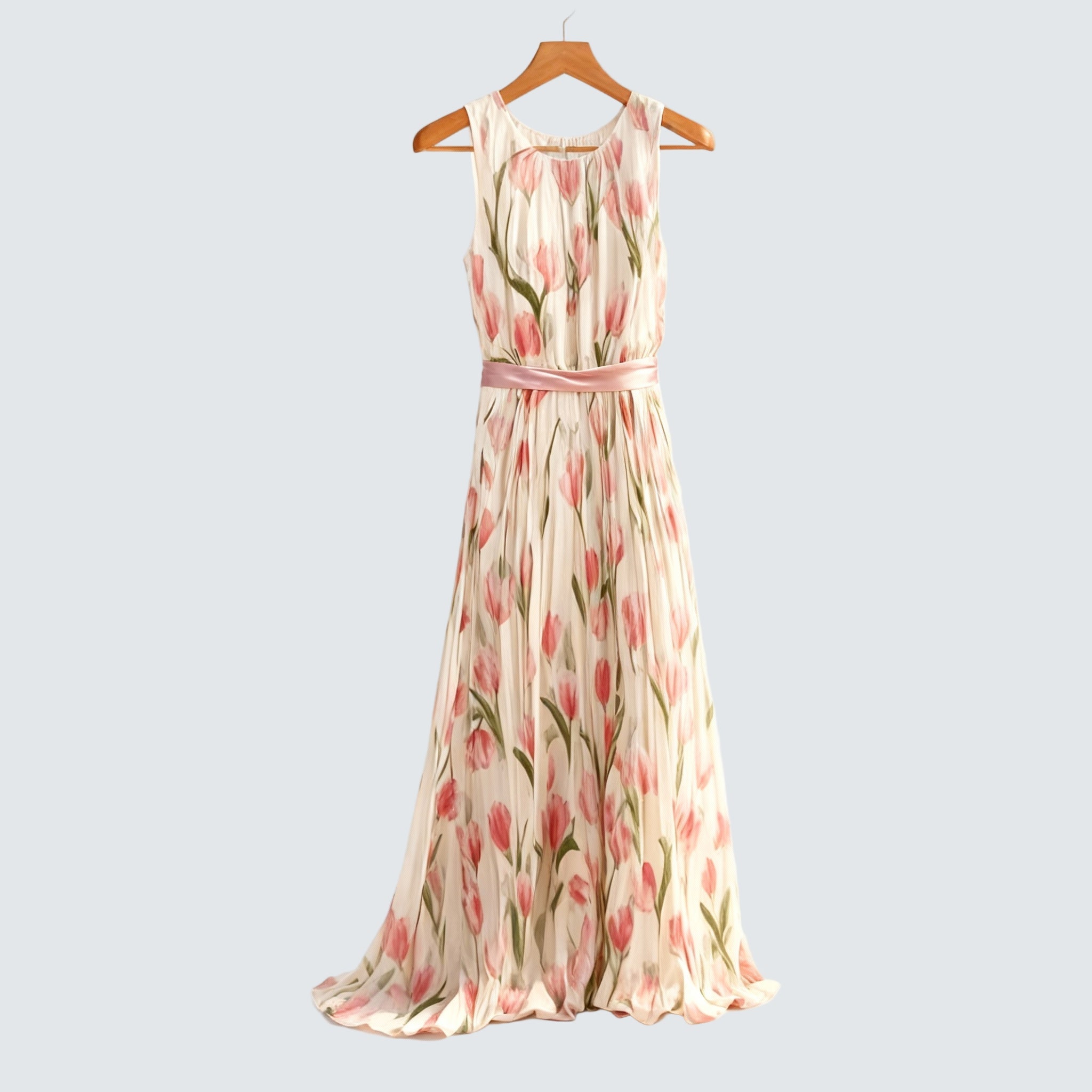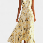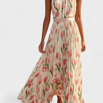 Роклята Juliene съчетава романтичен цветен принт с лекотата на плисирания дизайн, който придава на всяка крачка грация и елегантност. Безрамковият крой и нежният кръгъл деколте създават хармонична силует, докато коланът на талията подчертава женските линии. Идеален избор за летни дни, сватби и тържествени моменти на открито.