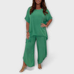 Fedezd fel kényelmes és laza két részes szettünket, amely az egyszerű eleganciát a maximális kényelemmel ötvözi. Tökéletes a mindennapi használatra, ez a szett egy laza blúzból és hosszú, hétköznapi nadrágból áll — ideális tavaszra, nyárra és őszre.
