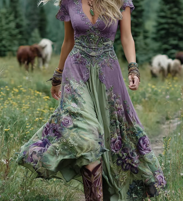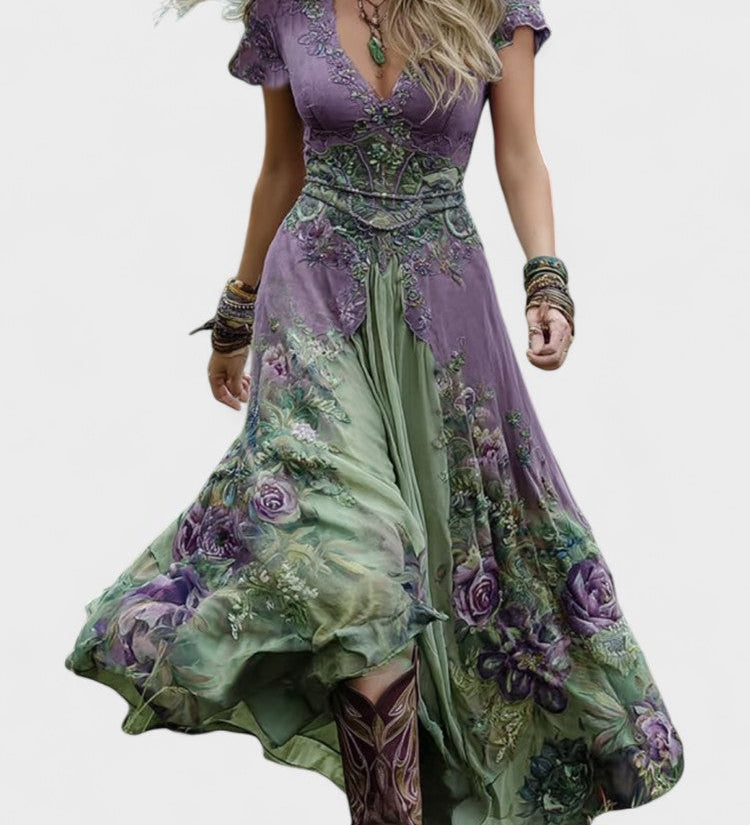 Serena™ | Virágmintás Lila Rövid Maxi Ruha Elegáns Kivitelben