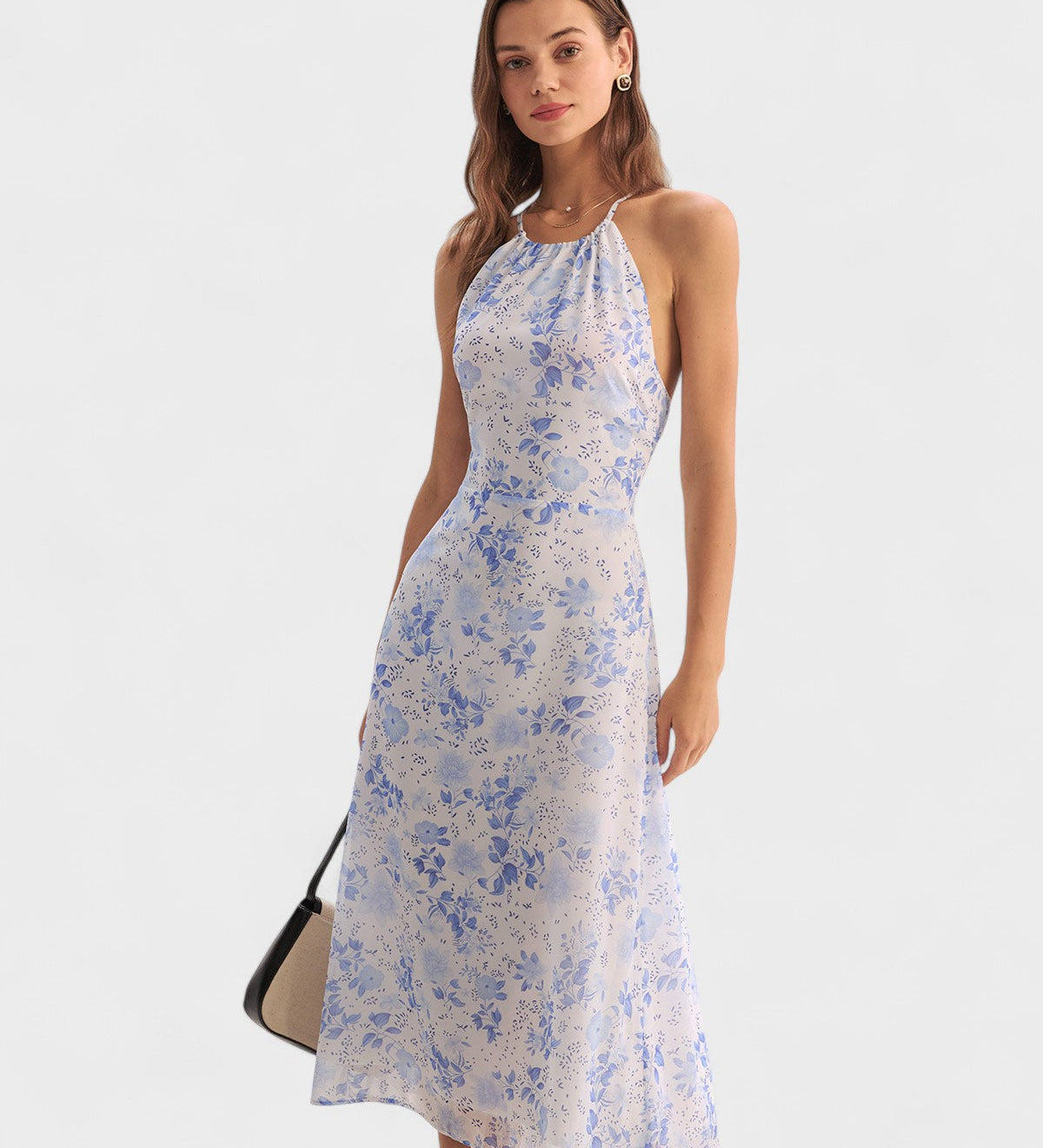 Clarice | Midi Kék Virágos Ruha Halter Dekorral