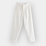 Ezek a nadrágok diszkrét eleganciát és laza stílust árasztanak. A szabad vonalvezetés és kellemes textúra ideális választás az olyan outfitekhez, amelyek eleganciát igényelnek túlzás nélkül – reggeltől az irodában egészen a délutáni kirándulásig.