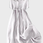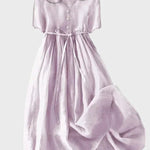 Ez a lágy lila ruha eleganciát és romantikát sugároz, ideális minden nő számára, aki ki szeretne tűnni egy időtlen megjelenéssel. Minimalista szabása kiemeli a nőiességet, míg a derékon lévő öv diszkrét bájjal hangsúlyozza a sziluettet.