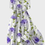Ez a stílusos maxi ruha, fehér alappal és lila virágokkal, a frissességet és a nőiességet sugározza. A könnyű anyag és a laza szabás ideálissá teszi a tavaszi és nyári megjelenéseidhez.