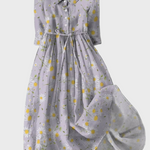 Ez a bájos, hosszú, lágy lila ruha ideális választás egy friss és tavaszi megjelenéshez. Diszkrét dizájnja fehér és sárga margarétákkal könnyed és vidám érzést közvetít, míg a derékban található öv tökéletes illeszkedést biztosít.