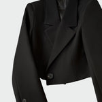 Minimalista rövid blézer elegáns dizájnnal és modern részletekkel. Az éles vonalakkal készült gallér és a frontális zárás dinamikus karaktert kölcsönöz, míg a rövid fazon ideálissá teszi stílusos megjelenésekhez. Könnyen viselhető szakmai alkalmakon és éjszakai eseményeken is.