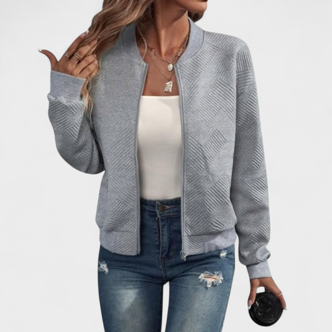 A Dora bomber dzseki kortalan klasszikushoz ad modern érintést. Finom geometriai mintázattal, praktikus cipzárral és bordázott mandzsettákkal a tökéletes illeszkedésért, könnyű és ideális bármilyen megjelenéshez – a farmernadrágoktól a ruhákig – bármely évszakban.