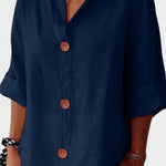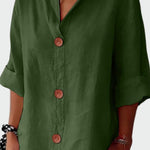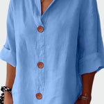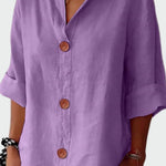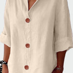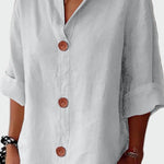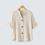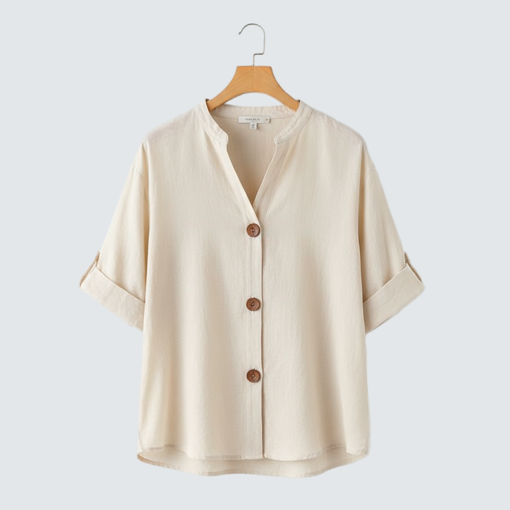 Стилна ленена риза в естествено бял нюанс, удобен кройка и 3/4 ръкави в класически стил. Дървените копчета отпред придават естествен и минималистичен вид, а свободният кройка я прави идеална за ежедневно носене. Лесно можете да я комбинирате с дънки или панталони за по-непринуден или елегантен вид.